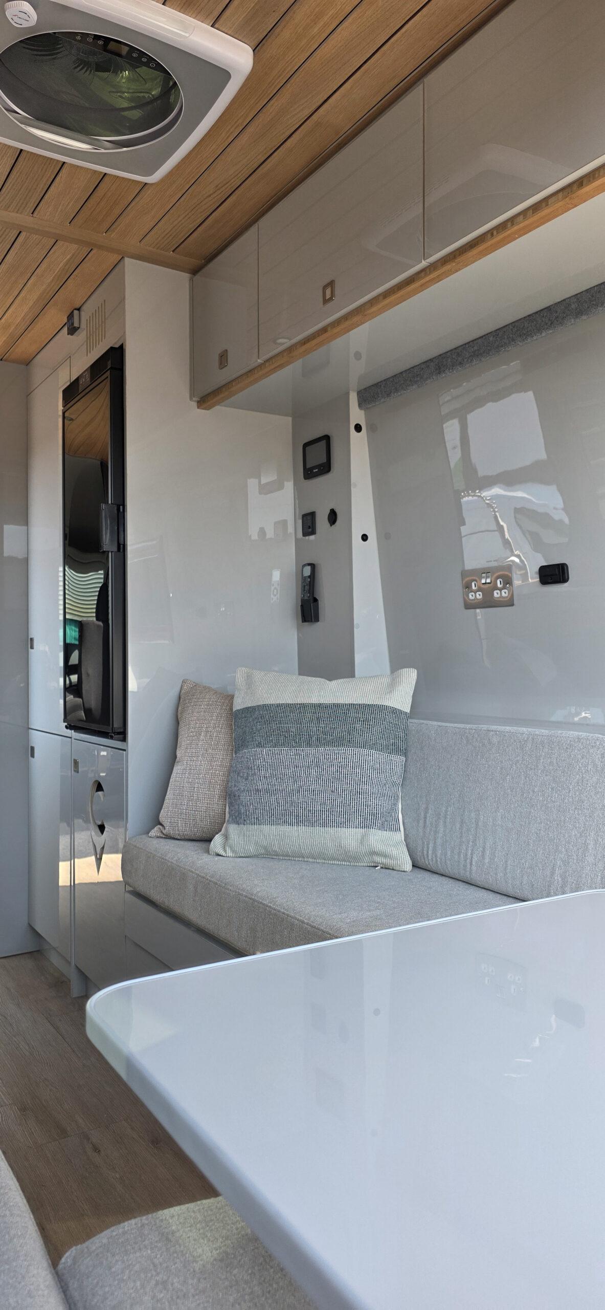 We have a variety of conversion packages available, each of which is finished in our signature ‘home away from home’ style. All of our furniture and ceiling/wall finishes are designed in-house with CNC precision, and are created using laminated lightweight ply, meaning they are a lot stronger and more scuff-resistant than a standard painted finish. And with a variety of colour options available, we can work with clients to ensure each interior is in line with their own individual taste. If you would like to see some examples of our work, you can do so here.